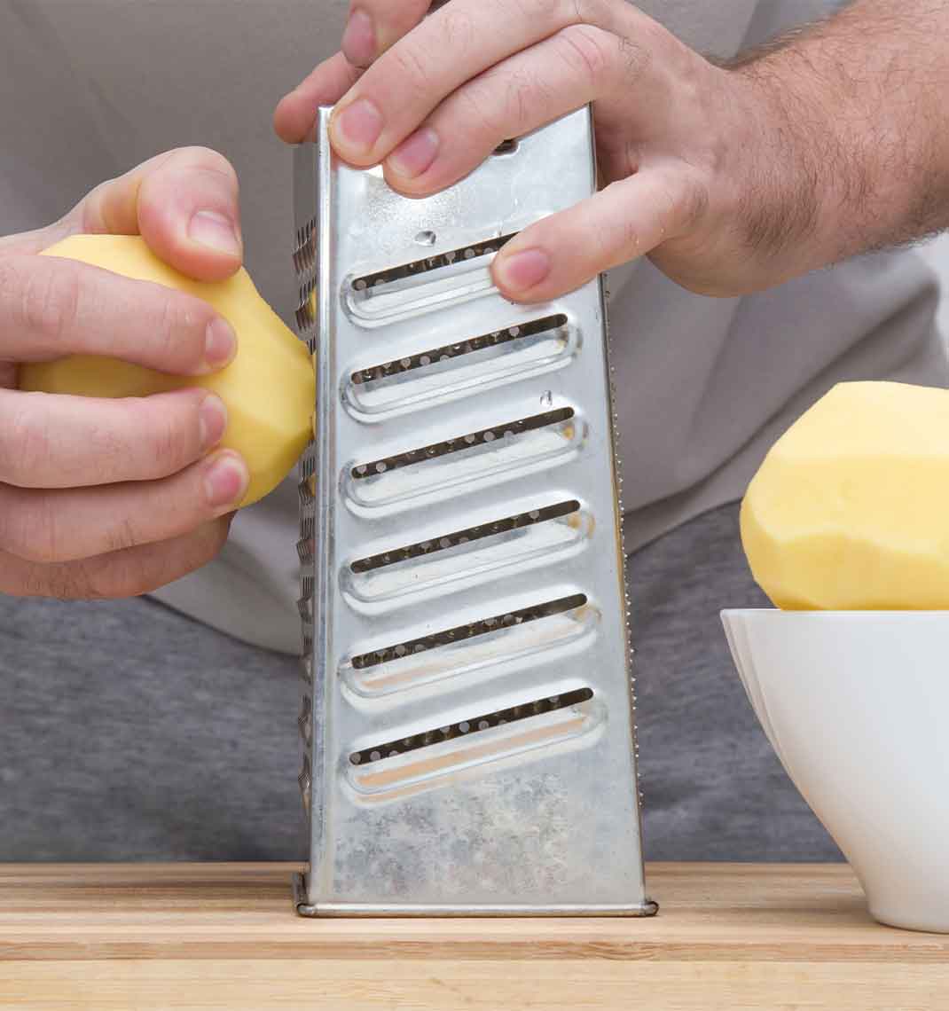 In addition to reducing prep time, the speedier process of grating with Grandma Ann’s provides another important benefit by protecting the flavor and consistency of your potato-based dishes. When you grate by hand, the food you’ve already grated will begin to oxidize as you continue to grate the rest. In fact, cut potatoes can oxidize in as little as a few minutes, so by the time you hand-grate several pounds of potatoes, you're likely to end up with a bowl of brown mush–yuck!–instead of the fresh firm texture your dish calls for. Of course, you can add something (such as lemon juice) to your prepared potatoes to prevent oxidation–but not without sacrificing the flavor of your dish. And submerging the gratings in water to keep them from browning will also make them mushier, impacting the consistency of your baked kugelis.